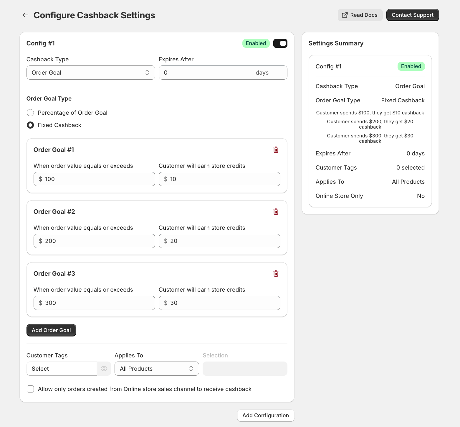 We allow you to setup more than just one order goal per store and enable multiple configurations that you can  setup for different customer types / tags.&#x20;