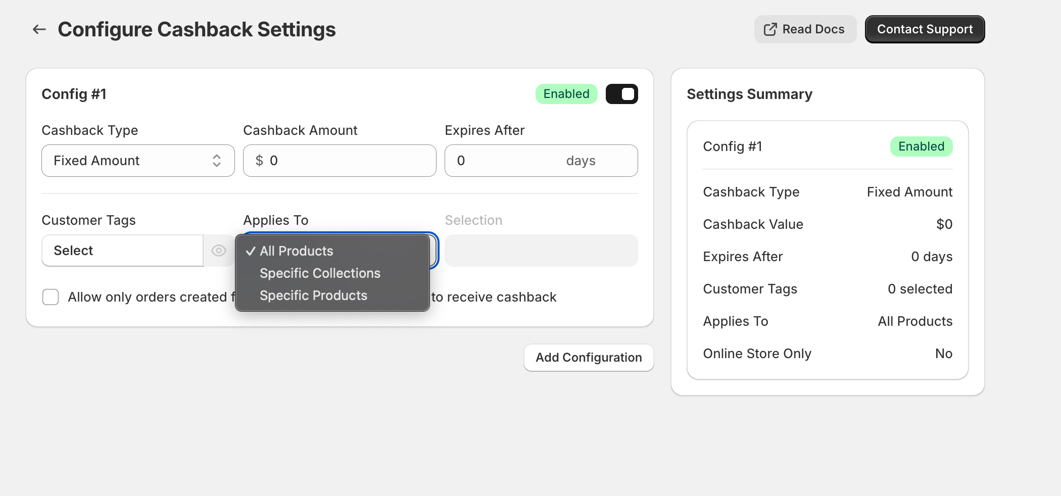 If multiple cashback configurations apply (e.g., one for "All Products" and another for a specific collection), the system will apply the **best matching config per line item**.