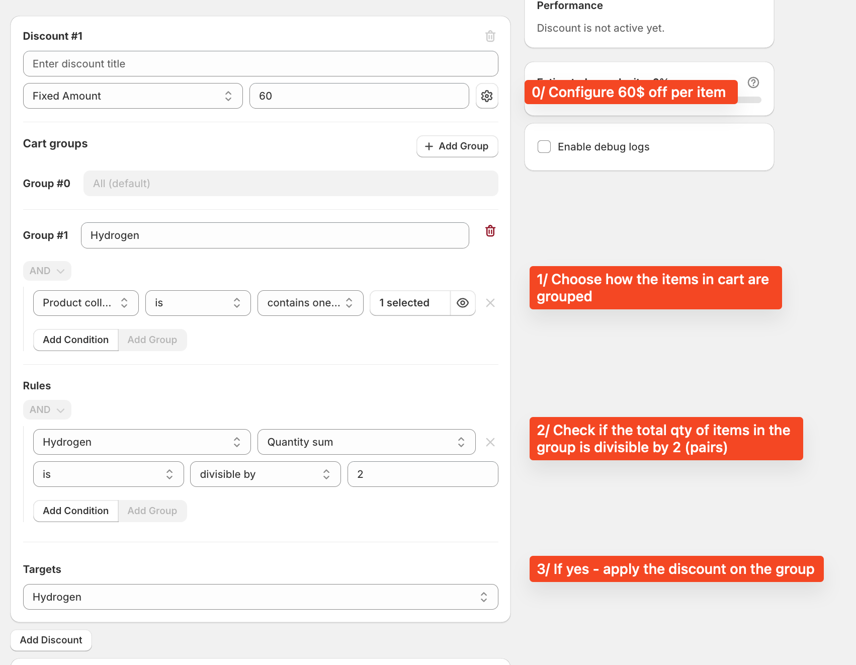 This guide walks you through how to set up a discount where customers receive **$60 off on each item** in a group **only when purchased in pairs**. This is perfect for promotions like “Buy 2, get $120 off” (i.e., $60 off per item, in sets of 2).