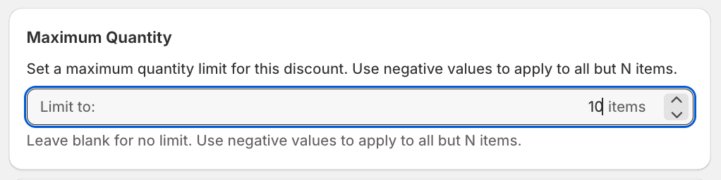 Set up a maximum quantity limit to ensure that the discount is only given up to a certain extent. For example, if you want only 10 items to get the discount at any point - you can just input 10 into the max quantity field showcased below